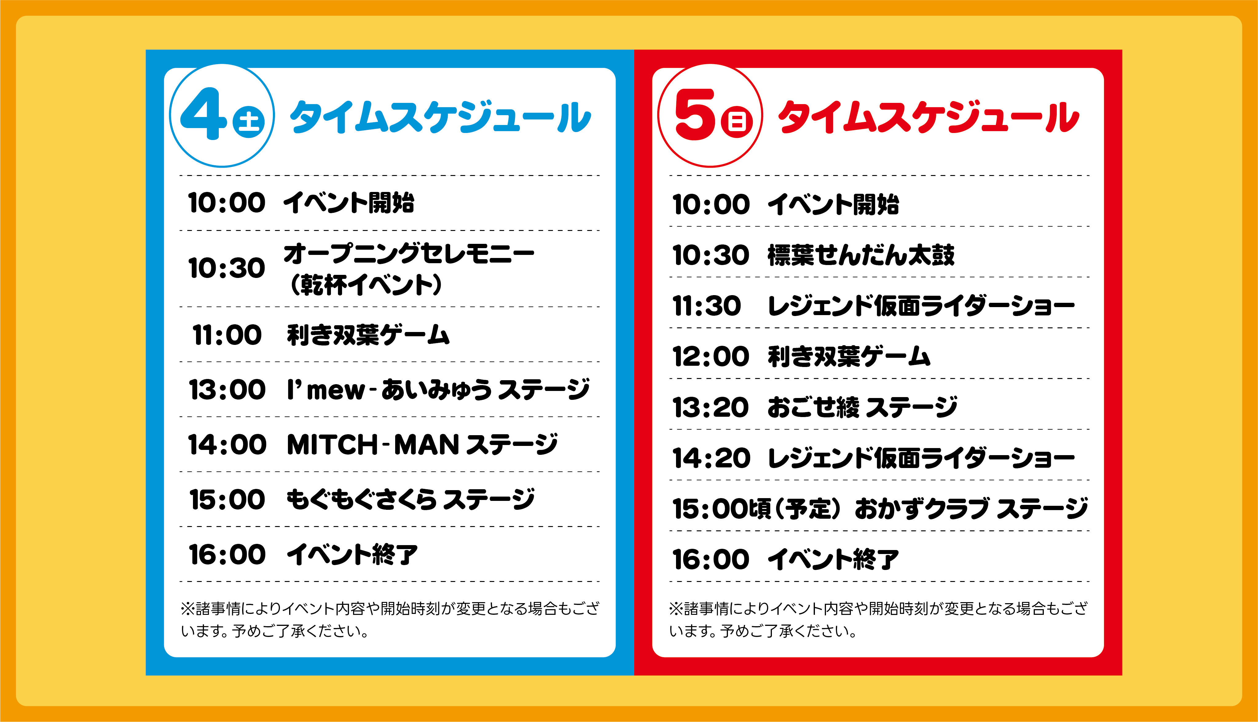 ●諸事情によりイべント内容が予告なく急遽変更になる場合があります。
